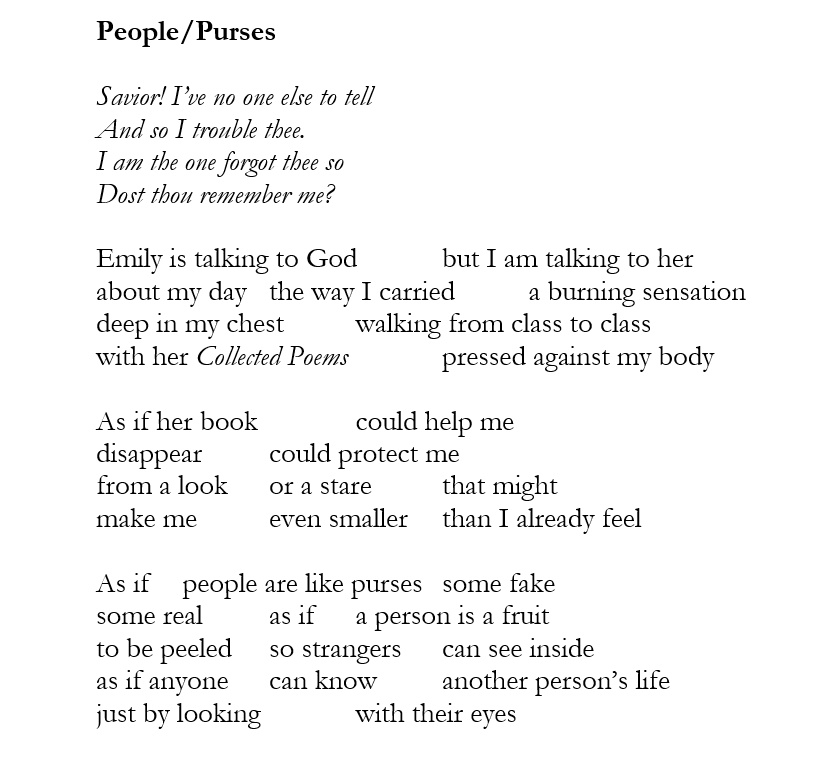 The excerpt from Are you Nobody, Too? titled “People/Purses,” is introduced with the beginning of a Dickinson poem Savior! I’ve no one else to tell - / And so I trouble thee. / I am the one forget thee so – Dost thou remember me? that Tina notes as #295 before she reads. This is the poem’s number in the collected works published by Ralph Franklin. In the Thomas Johnson edition of her collected works, it’s #217. You may see poem numbers noted as J-something or Fr-something; this system is what is being referred to. The Dickinson poems that you find online at the major sites such as the Academy of American Poets and the Poetry Foundation normally note the Franklin numbers. You can read the complete J217/Fr295 here.